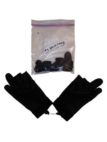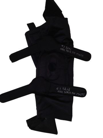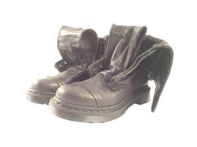 Rain (Michelle Rodriguez) "stunt #103" screen worn black pleather pants with riding strap on bottom (size 27W), black leggings and small black bullet proof vest (bullet holes on front & back) with real side buckles. Includes gloves with two tips cut off and extra tips. Seen on screen after she injects herself and the bullets come out through her fingertips. Also includes a pair of 'Dr. Martens' black lace up boots with grommets (distressed for filming, laces not included).