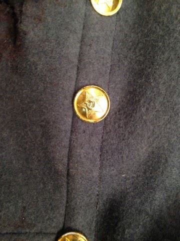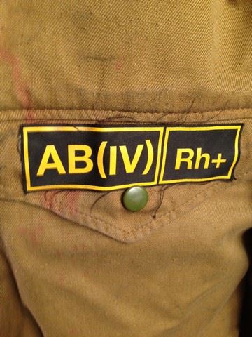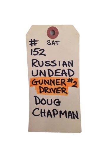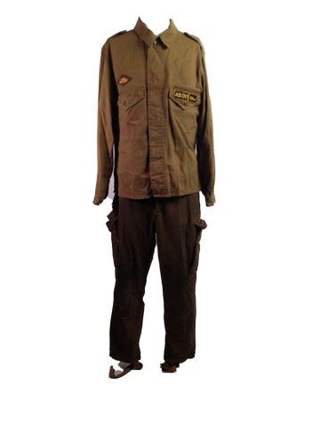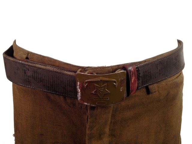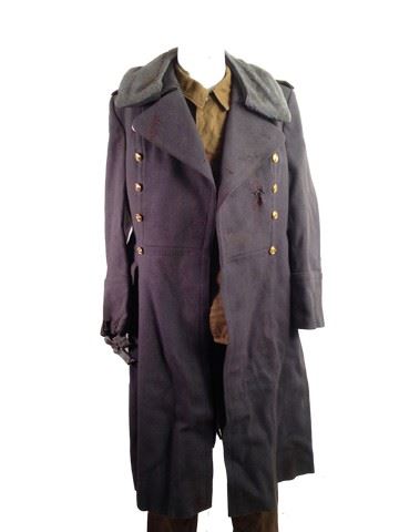 Russian Undead gunner driver #2's (Doug Chapman) screen used production distressed military coat with borg collar, gold colored buttons, and 3 patches. Coat is blood stained and zombie ripped. Includes beige color button down long sleeve shirt with blood stains and 3 patches(18.5) with matching pants(34). Also includes twill envelope cap and a leather military belt with a metal belt buckle. Wardrobe tag included.