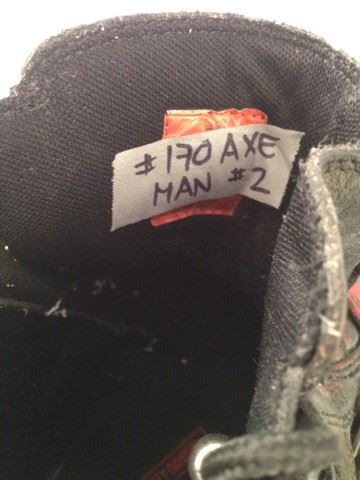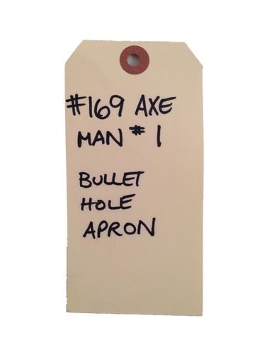 The Axe Man #1 (Ray Olubowale) screen worn, production distressed, large, black and blooded leather apron with bullet holes in the chest and a belt and large gold buckle in the back. Includes long red leather sleeve gloves, a pair of navy blue "Britches" cargo pants and a pair of big black bloodied boots with metal skull emblems on the tongue and sole. Wardrobe tag included.