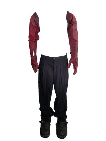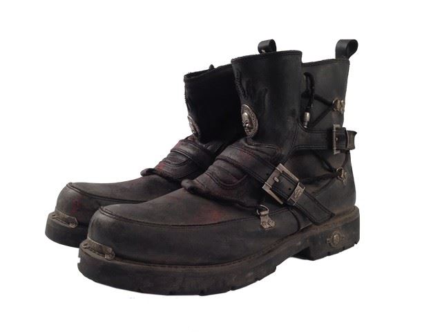 The Axe Man #1 (Ray Olubowale) screen worn, production distressed, large, black and blooded leather apron with bullet holes in the chest and a belt and large gold buckle in the back. Includes long red leather sleeve gloves, a pair of navy blue "Britches" cargo pants and a pair of big black bloodied boots with metal skull emblems on the tongue and sole. Wardrobe tag included.