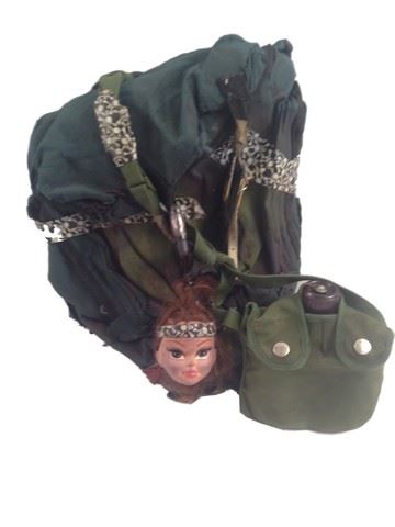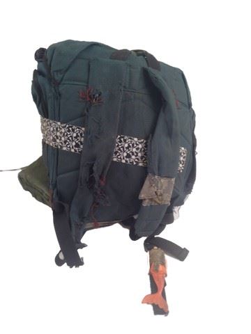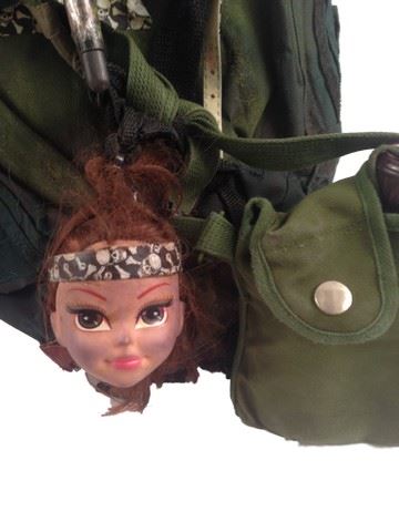 Abigail's (Ruby Rose) screen used, hero back pack with attached canteen in case and cut off doll head production soiled), with a mermaid doll figure attached to the right strap (approx. 14"x11")