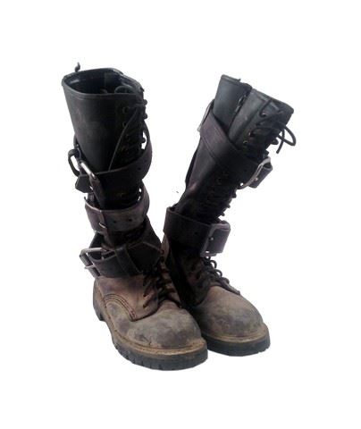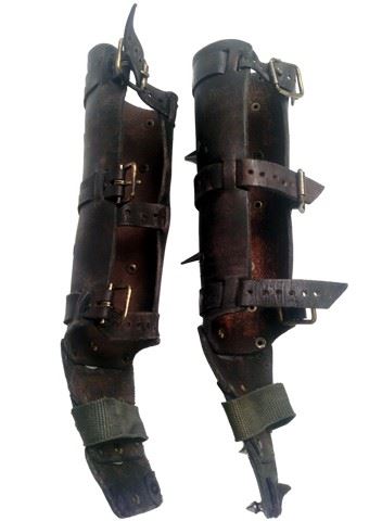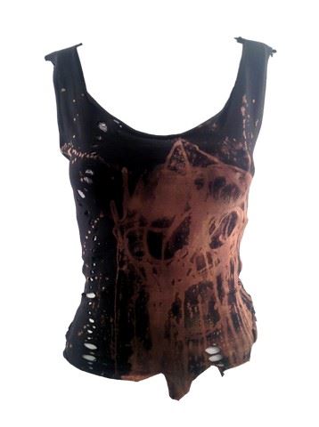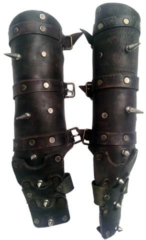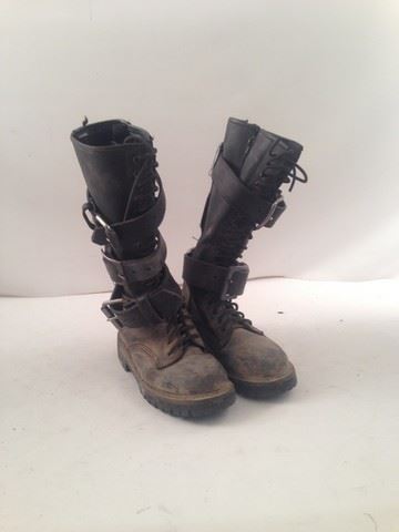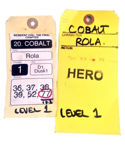 Cobalt (Rola) hero costume, labeled Level1. Includes arm gauntlets with metal spikes, sport top, black ripped and bleached custom tank, custom desisgned brown/green hooded jacket with skull design on the back, brown buckled boots and leather sword belt. Includes 2 wardrobe tags.