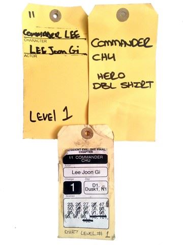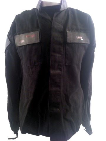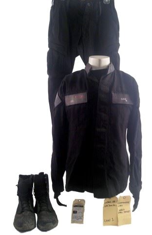 Commander Lee (Joon-Gi Lee) hero costume with black t-shirt, short sleeve (size S), cargo pants (size 32) black jacket (size M) with two custom, velcro patches (includes 2 extra patches that say "Lee) and Oakley boots (size 9). Black jacket has a production made stitch in the middle of the back. Includes 3 wardrobe tags.