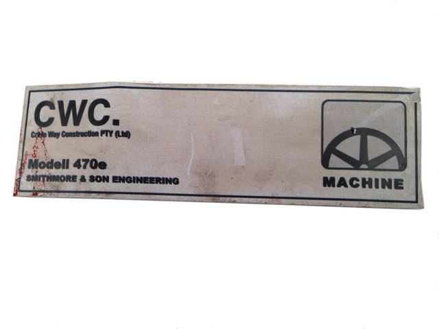 "CWC. Cable Way Construction PTY (Ltd) Machine, Modell 470e, Smithmore & Son Engineering" screen used, light production light, aluminum sign. (Approx. 8" x 2.5")