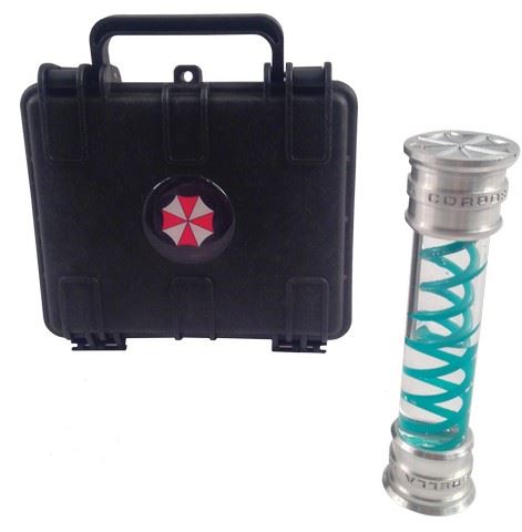 Dr. Isaacs (Iain Glen) hero DNA vial with case (case is cushioned with umbrella logo). Vial is surrounded by glass and sealed with metal ends that have the Umbrella Corp logos. (Vial approx. 6.5" x 1.5") (Case approx. 8" x 7")