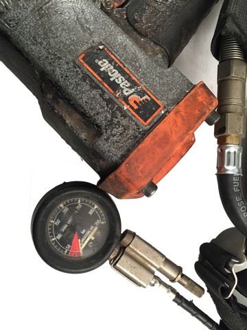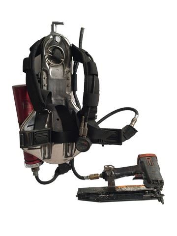 Dr. Isaacs (Iain Glen) screen used, hero nail gun with rig, includes oxygen tank, metal harness with straps and oxygen gauge (Approx. 13''x 25'')
