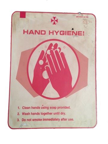 "Hand Hygiene" screen used cardboard sign with "Umbrella Corporation" symbol. (Approx. 8" x 6")