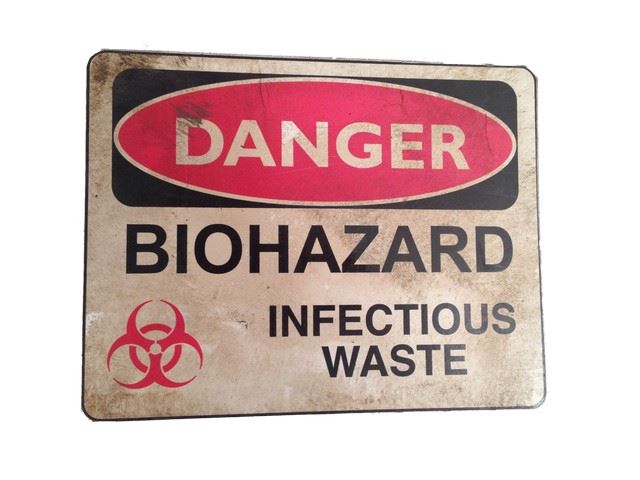 "Danger, BioHazard, Infectious Waste" screen used, production soiled sign with Umbrella Corporation Symbol. (Approx. 7.5" x 6")