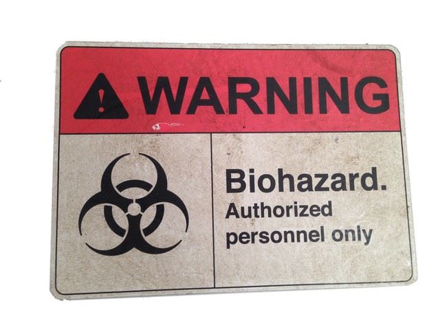 "Warning, Biohazard, Authorized personnel only" screen used, thin cardboard sign. (Approx. 8.5" x 6")