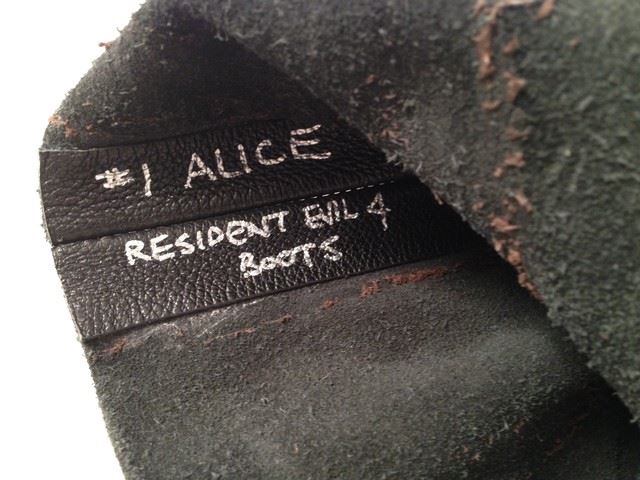 Alice (Milla Jovovich) screen worn, hero 'Joie' heavily worn and soiled leather thigh high boots with zipper on the side and laces in front (40), and grey knit leg warmers. "#1 Alice Resident Evil 4 Boots" has been written into the lining in silver ink by the costume department. Includes wardrobe tag.