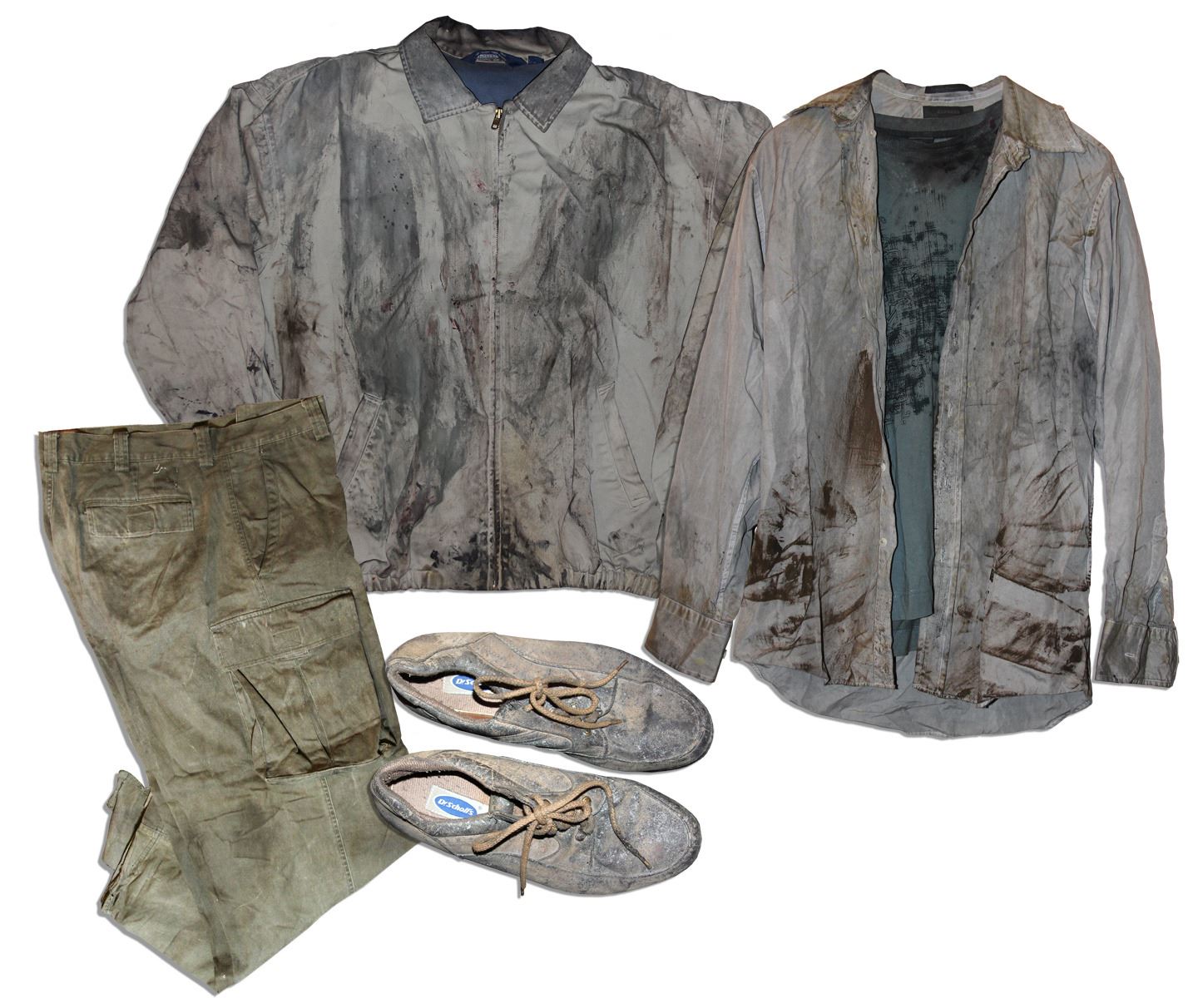 ''Resident Evil: Afterlife'' screen-worn zombie costume. Costume has been distressed by production with a great deal of stains and tatters. Consists of a Polo by Ralph Lauren jacket, blue Diesel brand t-shirt in size XXL, grey Express button-up shirt in size M, brown Structure brand pants in size 38'' x 30'' and Dr. Scholl's brand lace-up shoes. The 2010 film starring Milla Jovovich and Ali Larter combines elements of the horror genre with action and science fiction. Zombie costume is distressed, else near fine. With COA from Premiere Props.