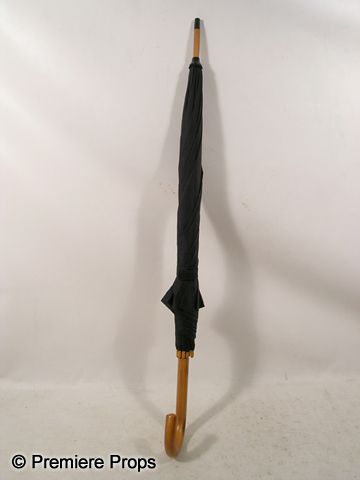 Screen used, hero, dark green with light brown wood handle folded up umbrella. (approx 35" long)