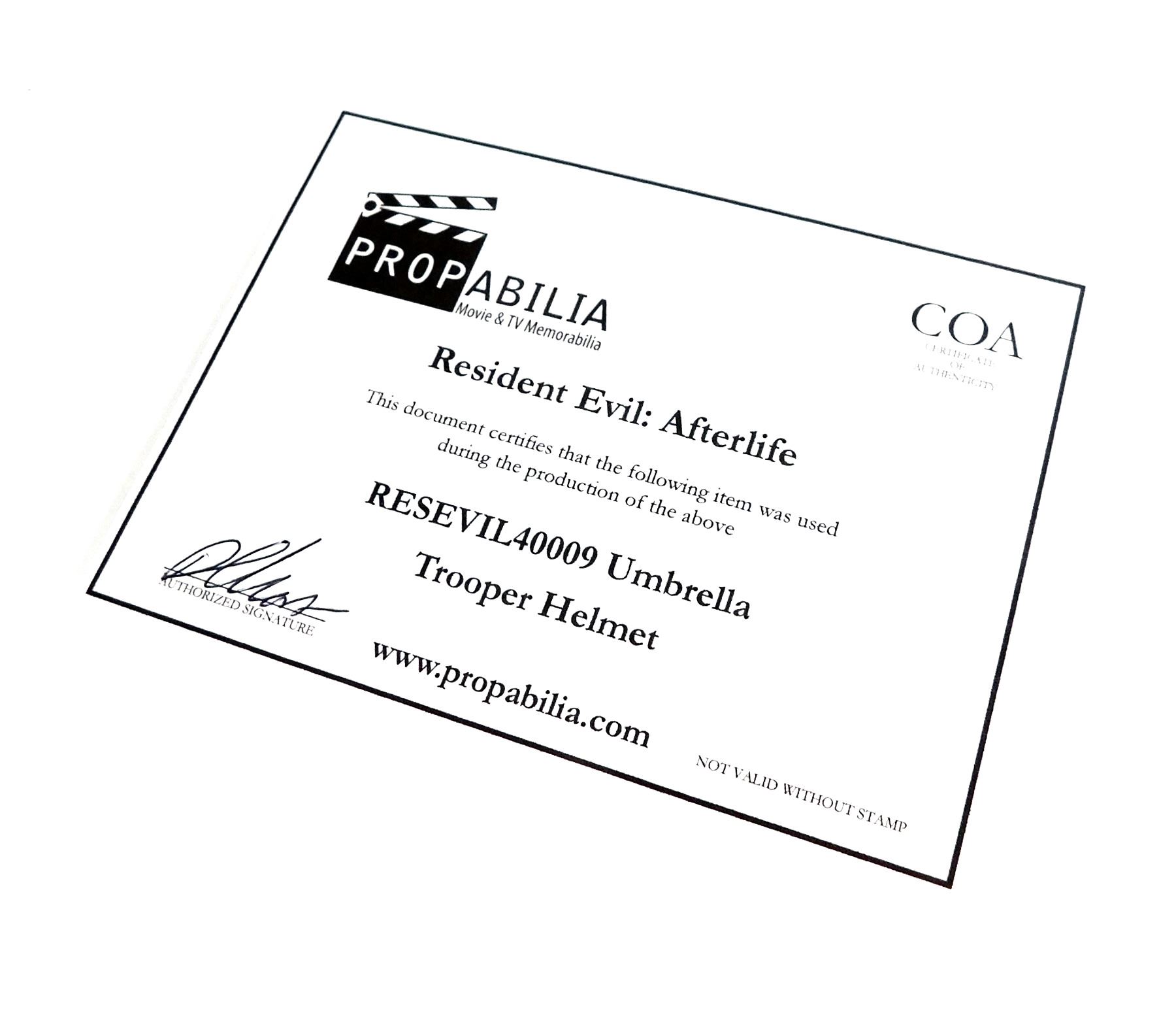 This helmet was acquired by the production for use in 'Resident Evil: Afterlife' (Constantin, 2010).