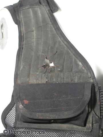 Resident Evil Afterlife - Umbrella Trooper's bloody, dirty, and sticky, black with zipper front, multiple pockets in the front and sides, mesh with thick foam front at the shoulders, 'Blackhawk' embroidered on the right and left chest and bullet holes on right chest, left chest, and two in the back, multiple straps and buckles, 'Blackhawk' tactical vest. (no size) (100% Polyester Mesh)