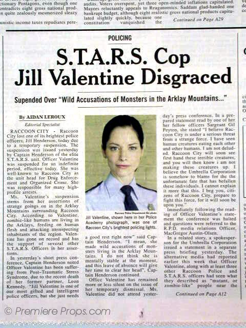 "The Raccoon Dispatch" Newspaper (features Jill Valentine) (this prop newspaper actually functions as three different papers! / back side of newspaper reveals "Raccoon City Times" Newspaper and "The Raccoon Tribune" Newspaper / designed and made by studio just for movie)