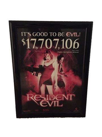 Resident Evil mini poster showcasing $17,707,106 made in the first 3 days. (16"x12"). Plexi glass frame. Hung in the producer's office for several years.