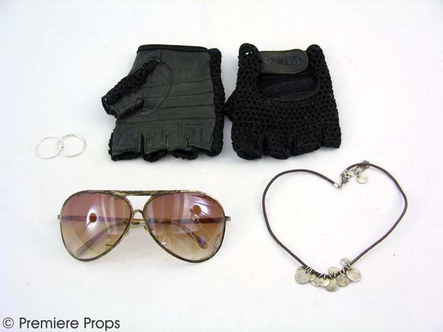 Betty's Accessories - Includes brown leather band necklace with tarnished silver metal charms. Silver hoop earrings. Tarnished gold frame sunglasses with brown faded lenses. Black fingerless gloves. (screen worn)