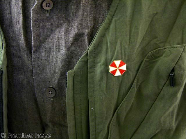 Resident Evil: Extinction (2007) - Dr. Isaacs' (Iain Glen) screen worn, green "Aigle" multi pocket zip vest with Umbrella pin (*Dark stain on left shoulder) (Inside reads "Dr. Isaac #1") (size L). Brown "Murano" L/S button up shirt (size M). Green cargo pants (*Some dark stains) (Inside reads " Dr. Isaacs 1"). Brown belt with silver buckle (Inside reads "Dr. Isaacs"). Brown leather "Wolverine" boots (*Slightly bloody / Distressed) (Inside reads "Dr. Isaac") (size 10.5). (Includes wardrobe tag / screen worn).