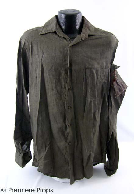 Dr. Isaacs' screen worn, tattered bloody green "Aigle" multi pocket zip vest with Umbrella pin (Inside reads "Dr. Isaacs #1") (size L). Torn and bloody brown "Murano" L/S button up shirt, green cargo pants.