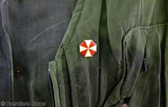 Dr. Isaacs' screen worn, tattered bloody green "Aigle" multi pocket zip vest with Umbrella pin (Inside reads "Dr. Isaacs #1") (size L). Torn and bloody brown "Murano" L/S button up shirt, green cargo pants.