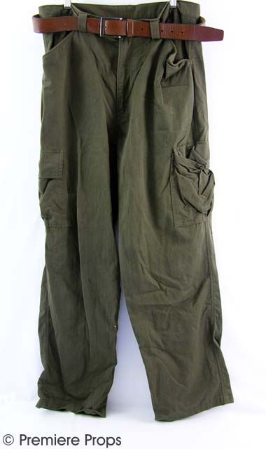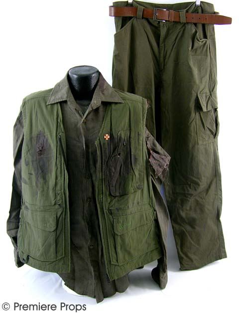 Dr. Isaacs' screen worn, tattered bloody green "Aigle" multi pocket zip vest with Umbrella pin (Inside reads "Dr. Isaacs #1") (size L). Torn and bloody brown "Murano" L/S button up shirt, green cargo pants.