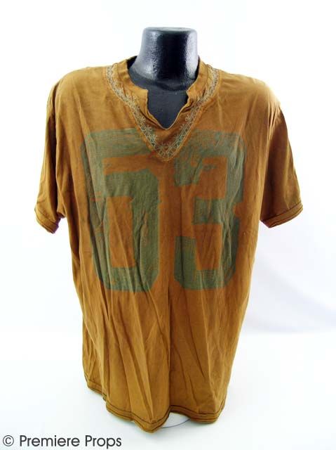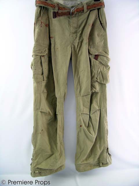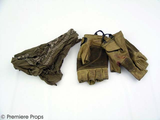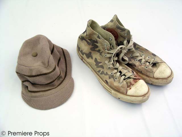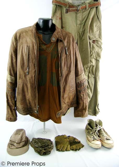 The complete, screen worn costume from 2007's 'Resident Evil: Extinction. The ensemble, worn by L.J. (Mike Epps) includes: a brown leather "Schott" multi-zippered jacket (size XL); an orange, embroidered v-neck short sleeve t-shirt with iron-on numbered '63,' and 'Griffin' label; a pair of Khaki "Abercrombie" cargo pants and orange diamond pattern cloth belt, with remnants of stage blood (size L); a pair of tan and brown leather "Metolius" finger-less gloves, also stained with stage blood (size L); a worn, brown and paisley bandana; a tan 'Akademiks' billed beanie cap with brown stripes; and a pair of beige & tan camouflage 'Converse All-Star' hi-top sneakers, stained with stage blood. (size 11). All items appear aged and distressed from filming and are heavily soiled. Several items have "LJ" written on the inside).