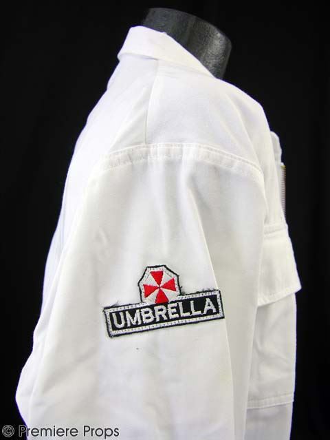 Umbrella Lab Tech's coveralls/jumpsuit with Umbrella patches on each shoulder, 6 pockets, zips open in front (Inside reads "Lab Tech") (size 42). White rubber gloves (size L 8.5-9). (screen worn)