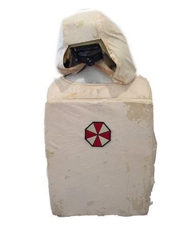 Screen worn Umbrella Hazmat Suit - includes vest with padded backing and Umbrella logos on both sides (*Small blood stains). Helmet with mirror lens and Umbrella logo (*Backside is coming apart slightly at vent). Rubber gloves (size L). Rubber "Dunlop" boots (*Slightly bloody) (No U.S. size / size 30). (*Costumeis peeling from age)
