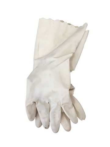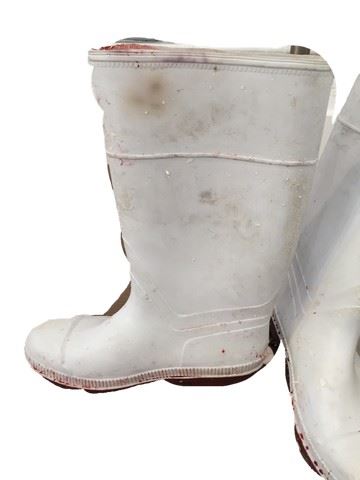 Screen worn Umbrella Hazmat Suit - includes vest with padded backing and Umbrella logos on both sides (*Small blood stains). Helmet with mirror lens and Umbrella logo (*Backside is coming apart slightly at vent). Rubber gloves (size L). Rubber "Dunlop" boots (*Slightly bloody) (No U.S. size / size 30). (*Costumes peeling from age)