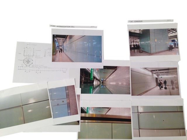 Interrogation cell drawing copy with color copied photos of the corridor design inspiration (8 1/2" x 11"). From Resident Evil: Retribution.
