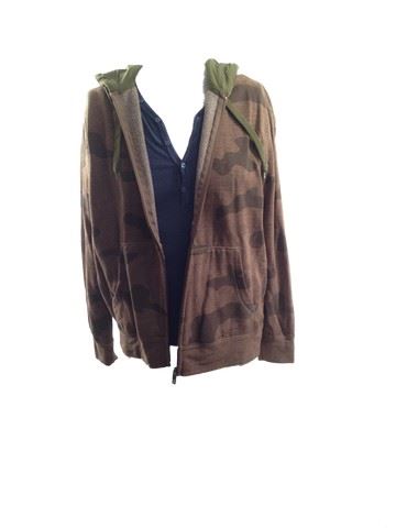 Koichi screen worn, "H&M" blue longsleeve shirt (S), "Urban Heritage" khaki brown/slightly green camo zip up hoodie (M). Seen in Alice's fight against J Pop girl and Shibuya undead.