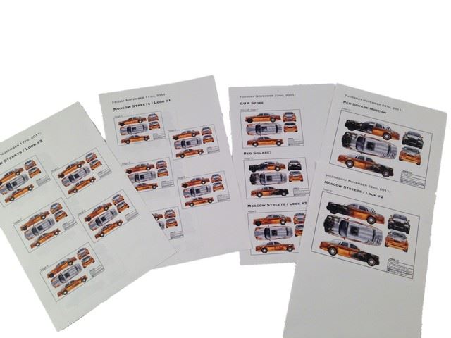 Moscow streets production reference graphics for when the window gets blown out and the car goes through flames in Resident Evil: Retribution (approx.11"x17", 7 pages)
