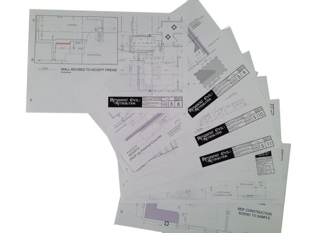 Resident Evil: Retribution copied blue prints for the revised kitchen plan, fireplace, kitchen cabinets and tile and countertop, reflected ceiling, and kitchen middle island. Created and used by the set department on the production. (7 pages 17" x 11")