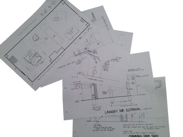 Resident Evil: Retribution copied blue print of studio placements and copied drawings of the porch roof, laundry room, suburban dark park sign. Created and used by the set department on the production. (6 pages 17" x 11")