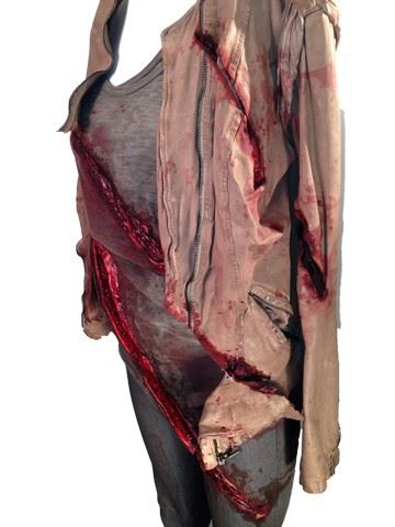 Rain (Michelle Rodriguez) screen worn, hero,  "good Rain dirty", production soiled with blood and wound grey"Diesel" jeans (size 27W), wound on grey "Alternative" tee shirt(LG), production blood on light brown "GIORGIO Brato"leather jacket, grey "Zara" suede high heel booties (size 39) and crystal stone necklace with two wrap bracelets.