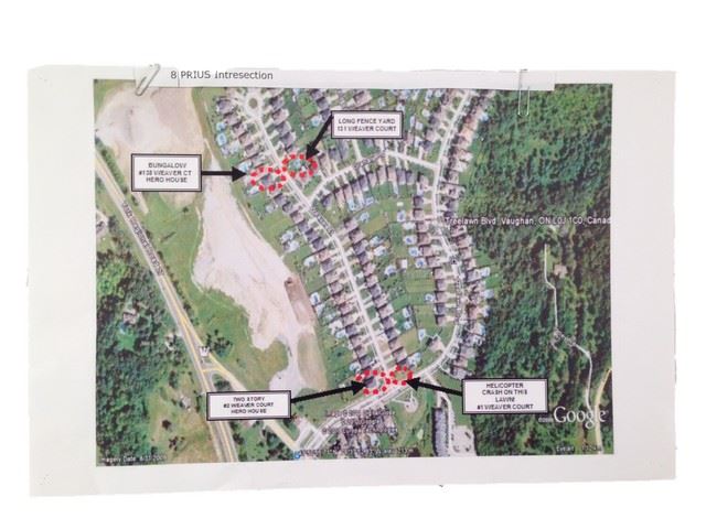 Ariel view google map printed photo for the Prius intersection scene in Resident Evil: Retribution. Points out landmarks to be seen in the film, such as Helicopter crashed on the lawn. (Approx. 17"x11")