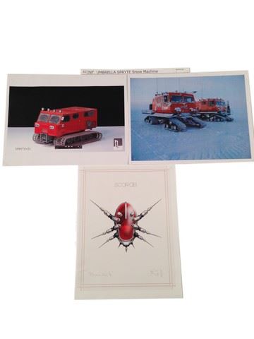 Resident Evil: Retribution Umbrella SPRYTE snow machine rendering and 1 scarab rendering (2 pages 8 1/2" x 11"), and a copied inspiration photo (8 1/2"x11").