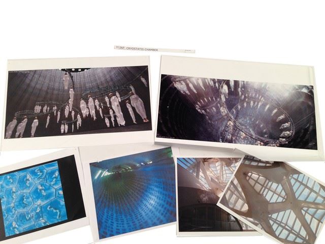 Resident Evil: Retribution Interior cryostatis chamber production renderings (2 pages 19" x13") with 4 inspiration color copied photos (8 1/2" x 11")