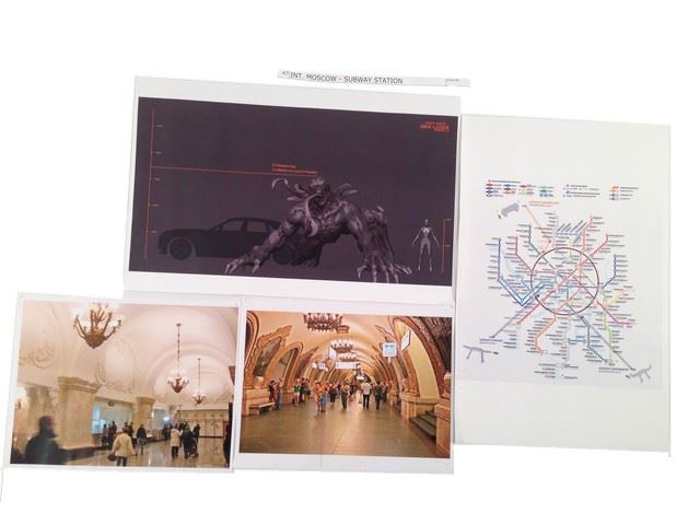 Resident Evil: Retribution Interior Moscow Subway Station rendering with zombie dragon and a station map (2 pages 17" x11") with 2 inspiration color copied photos (8 1/2" x 11")