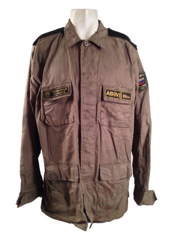 Screen worn, Russian undead heavily distressed for production, khaki four pocket military shirt with epaulets on shoulders and patch on sleeve. Condition may vary.