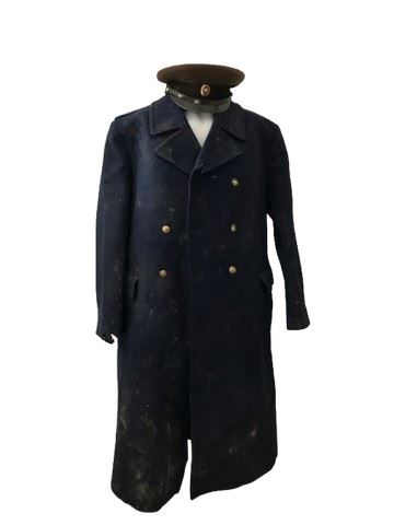 Screen worn, Russian undead heavily distressed and soiled for production blue wool coat and brown wool military hat.