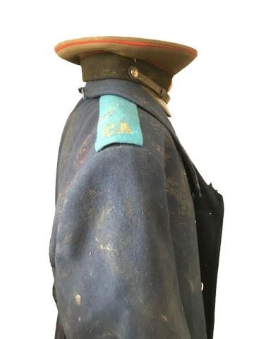 Screen worn, Russian undead heavily distressed and soiled for production blue wool coat and brown wool military hat.