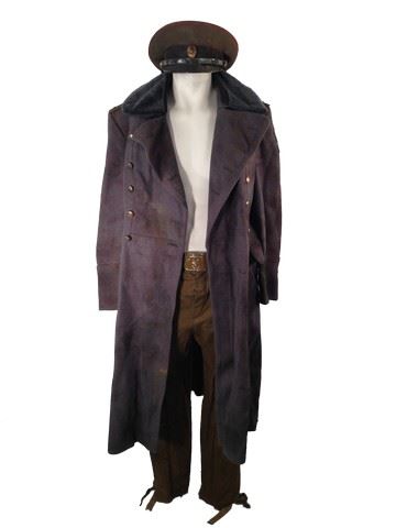 Screen worn Russian Undead military outfit, including: distressed for production heavy knee length overcoat, ragged cloth pants, belt with olive green metal buckle, officer's hat, and faux fur collar. All items heavily distressed for production. Condition may vary.