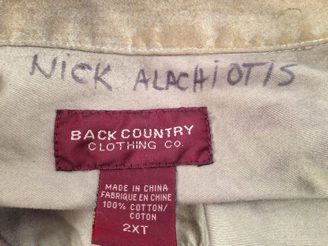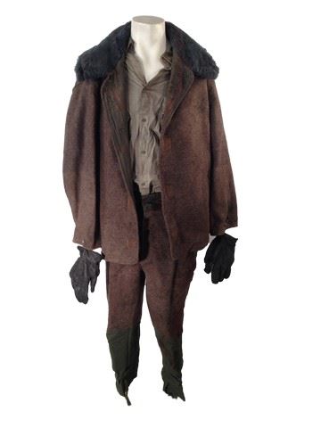 Stunt performer Nick Alachiotis Russian undead heavily distressed for production brown wool coat and pants, 'Back Country' bloody and distressed long sleeve shirt (2XT), and black nylon gloves (L). The stunt performer's name has been written into the collar of the coat and shirt by the wardrobe department.