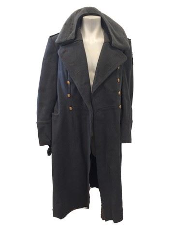 Screen worn, Russian undead, heavily distressed and soiled for production, grey wool coat with fur collar.