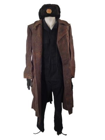 Screen worn, stunt, Russian undead heavily distressed for production military overcoat with Russian patch and epaulets, 'Propper' black long sleeve shirt (M), 'Propper' black cargo pants (waist 31-35, inseam 29.5 - 32.5), faux fur hat, and black rubber gloves.