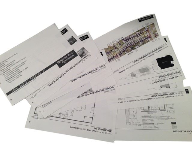 Resident Evil: Retribution Tech Survey Package of copied blueprints for the elevator shaft, air vents, Moscow, New York streets, White House, Oval Office, suburban neighborhood, and Arcadia. Created and used by the set department on the production. (11 pages 17" x 11")
