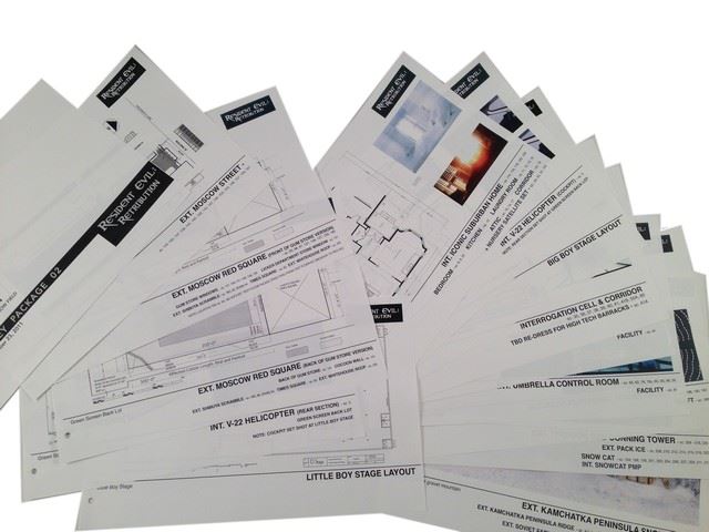 Resident Evil: Retribution Tech Survey Package of copied blue prints for Moscow street, Red Square, V-22 helicopter (cockpit and rear section), iconic suburban home, interrogation cell, corridor of light, Umbrella control room, Soviet facility, and Kamchatka Peninsula snow field. (16 pages 17" x 11")