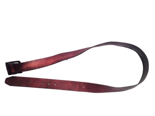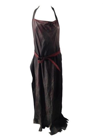 The Axe Man (Ray Olubowale) screen worn, production soiled brown long leather apron, labeled "#169 Axe Man #1". Reddish brown leather "Fossil" belt, labeled "#169 Axe Man #1" with tape. Production soiled red leather shoulder length gloves, labeled "#169 Axe Man #1" with tape. From Resident Evil: Afterlife and Retribution. (Apron approx. 55.5" x 29") ( Belt approx. 51" x 2") (Gloves approx. 32" x 8")