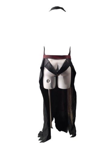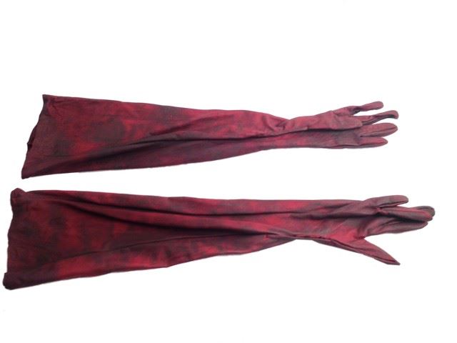 The Axe Man (Ray Olubowale) screen worn, production soiled brown long leather apron, labeled "#169 Axe Man #1". Reddish brown leather "Fossil" belt, labeled "#169 Axe Man #1" with tape. Production soiled red leather shoulder length gloves, labeled "#169 Axe Man #1" with tape. From Resident Evil: Afterlife and Retribution. (Apron approx. 55.5" x 29") ( Belt approx. 51" x 2") (Gloves approx. 32" x 8")